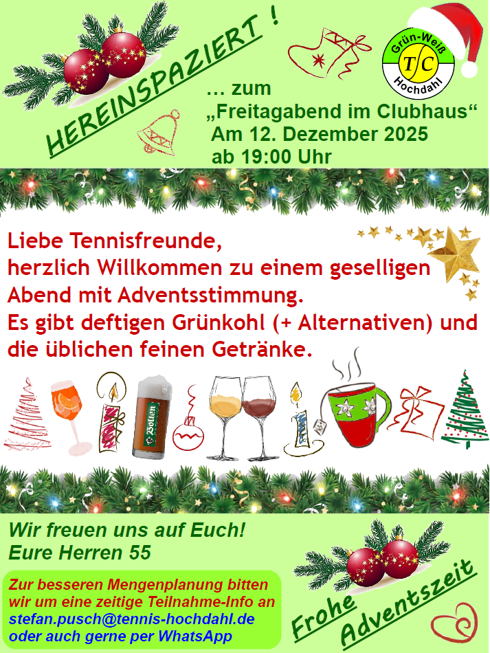 Clubhaus des TC Grün-Weiß Hochdahl e.V. Celsiusstr. 5, ErkrathHallo liebe Clubmitglieder, wir freuen uns auf zahlreiche Anmeldungen Eure Herren 55
